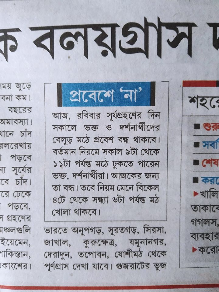 দেগে দেওয়ার এর চাইতে কি ভালো কৌশল হতে পারে। হায় রে গেরুয়াধারী অন্ধজীবীগণ, সেখানে নাকি নানা উচ্চমানের সব প্রতিষ্ঠানের বড় বড় ডিগ্রীধারী বিজ্ঞানবিভাগের ছাত্র আছে। এ কোন দেশী পড়াশোনা তাদের? ছি ছি। লজ্জার, ভীষণ লজ্জার। যারা এত উদারতার কথা বলে, যারা এত প্রগ্রেসিভ হাবভাব দেখায় তারাই এই অন্ধকারের প্রচারক। সারাটা দেশ যখন সামনের দিকে এগোতে চাইছে তখন একি ন্যাক্কারজনক সিদ্ধান্ত! এর পরেও বলা হবে বিবেকানন্দর জন্মদিন যুব দিবস! কোন যুবকদের ভাবের প্রতিনিধিত্ব করছেন তিনি? এই অন্ধকারময় সিদ্ধান্তের? কেন সেই গেরুয়াধারীরা জানে না যে চন্দ্রসূর্যপৃথিবীর কি অবস্থানে এই গ্রহণ হয়? নানা সিউডোবিজ্ঞান আছে, তাদের নানা যুক্তিও আছে। সেগুলো আস্তাকুঁড়ে শোভা পায়, বইয়ের তাকে নয়। ডারউইন, দেকার্ত প্রমুখ মানুষেরা চার্চের ভয়ে দীর্ঘদিন সত্য গোপন করেছিলেন। কি সত্য? প্রমাণিত সঙ্গত সত্য। আজ একি মূর্খামি! একি অজ্ঞতা! এই কি অন্ধবিশ্বাসের উদযাপন! এর পরেও হাজার হাজার শিক্ষিত মানুষ ওই প্রণামে লাইনে দাঁড়িয়ে থাকবেন। কিসের কৃপা পেতে? যারা বিশ্বাস করেন সূর্যের উপর চাঁদের আড়াল পড়লে খাওয়া যায় না? মন্দির খোলা যায় না? তবে সেই সব লক্ষকোটি ভক্ত বাড়িতেও এই নিয়ম হবে? হায় রে হায়! কি স্ববিরোধ! কি ভণ্ডামি! কি মধ্যযুগীয় উৎসব!