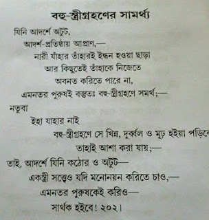 আমি শ্রীযুক্ত অনুকূলচন্দ্রের কয়েকটা কবিতা পোস্ট করাতে, আমাকে একজন 'চলার সাথী' বইটা পড়ে দেখতে বলেন। সেটা পড়তে গিয়ে 'বহুগামিতা' তত্ত্বে ঠেক খাই। স্মরণীয় বর্তমান ভারতীয় সংবিধান ধারা 494 ও 495 অনুযায়ী হিন্দু বিবাহ আইনে বহু বিবাহ দণ্ডনীয় অপরাধ। অথচ এই বইটা সংস্করণের পর সংস্করণ কি ভাবে হচ্ছে আর প্রচারিতই বা কোন আইন অনুসারে হচ্ছে?